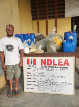 The effort paid off on Thursday 30th October 2025 when NDLEA officers raided the residential apartment in Ajao estate, Isolo Lagos which Kelechi converted to a laboratory for cooking Colos, a strain of cannabis produced with the psychoactive plant and various chemicals. Recovered from the apartment include: freshly cooked Colos weighing 16.2 kilograms; ADB-CHMNACA Cannabinol -1.7kg; Potassium Carbonate -4.5kg and Dibromobutane – 91 litres.